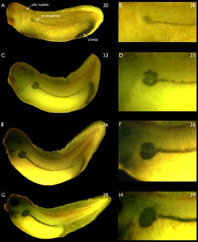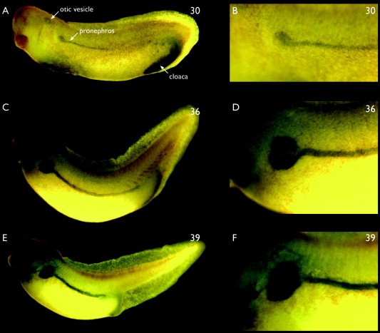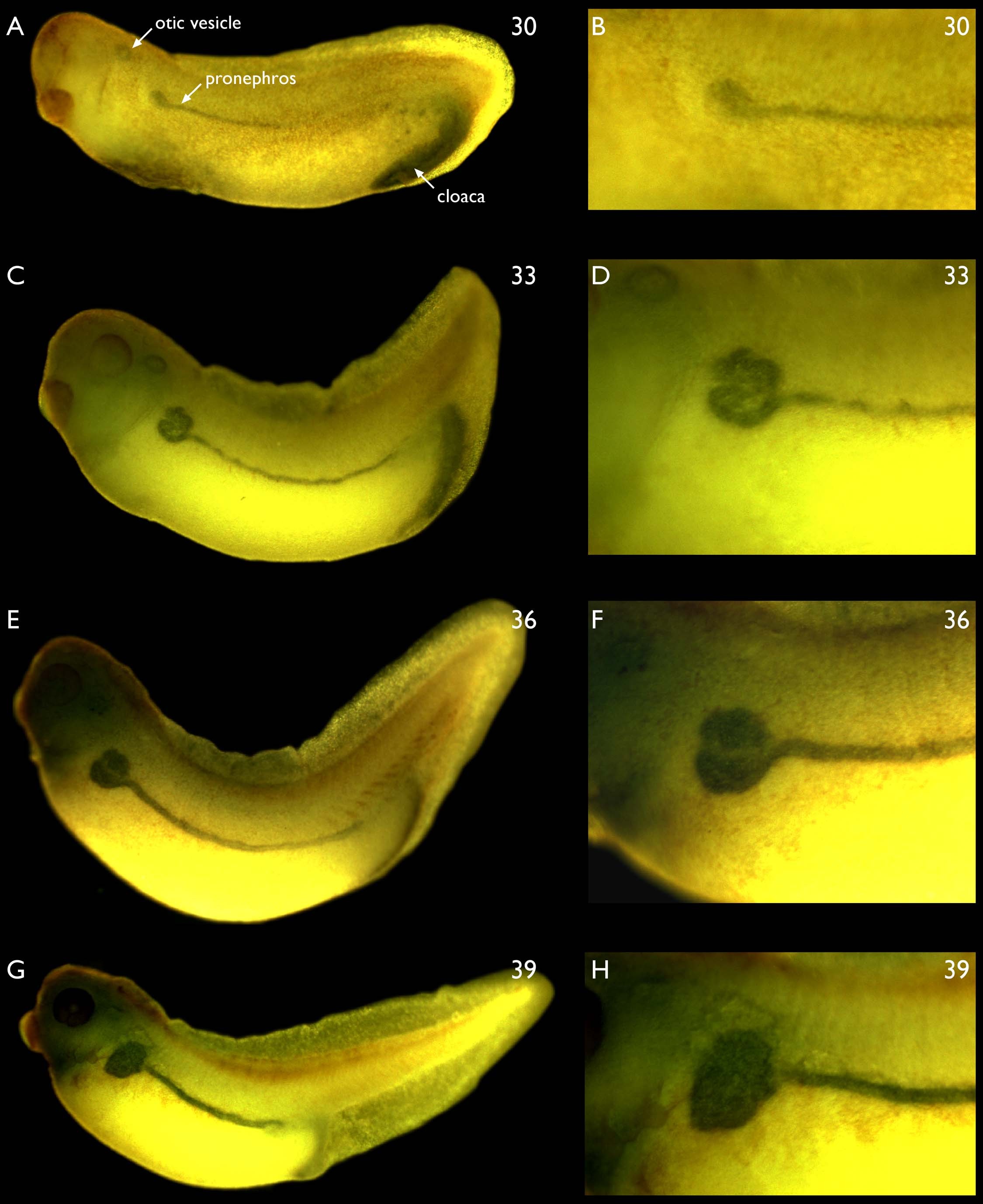 Collectrin/tmem27 encodes a transmembrane protein that plays a critical role in amino-acid transport. Originally described as being expressed only in collecting ducts, it has subsequently also been shown to also be expressed in the S1 segment of the proximal tubule of mammalian metanephric nephrons. In this report we describe the expression of collectrin in the simple embryonic kidney of amphibians, the pronephros. Each pronephros contains a single large nephron with a proximo-distal segmentation very similar to that of mammalian metanephric nephrons. Analysis of collectrin expression in pronephroi at a variety of embryonic stages indicates that this gene is expressed at very high levels throughout the pronephric system, including proximal and distal segments and the Wolffian duct. Expression in the pronephros commences at Xenopus embryonic stage 28 which corresponds to when epithelialization begins within the pronephric mesenchyme. Like the Na+K+ATPase/atp1a1, another highly expressed pronephric marker, collectrin is also expressed in the cloaca but not in the cloacal derived posterior segment of the Wolffian duct, the rectal diverticulum. Unlike the Na+K+ATPase, which is expressed at lower levels in proximal portions of the pronephric nephron, expression of collectrin is even throughout all of the pronephric epithelia. This expression domain extends far beyond that shown to express amino-acid transporters and indicates collectrin may function in facilitating additional transport processes. Its high level of expression and broad distribution make it an excellent marker with which to examine pronephric kidney development.