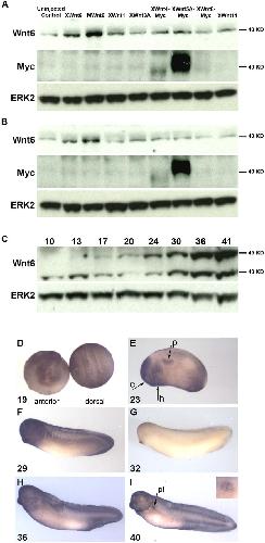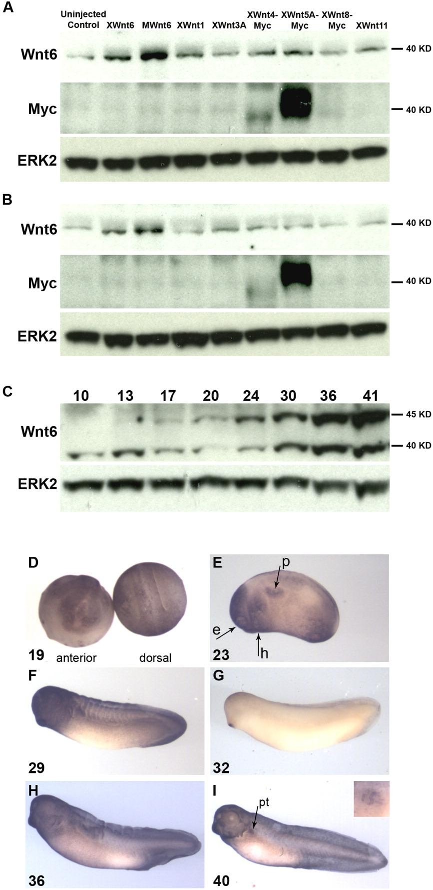 Figure 4. Wnt6 protein is expressed at different stages of development and is localized to the epidermis overlaying developing organs and at later stages to the pronephric tubules. A,B: Western blots showing both endogenous xWnt6 expression as well as overexpression of xWnt6 and mWnt6 in lanes two and three at 3 hr after injection (A) and 5 hr after injection (B). A,B middle panels: Immunodetection showing expression of myc-tagged proteins xWnt4 and xWnt5A at 2 hr and 5 hr after injection, respectively. A,B bottom panels: Immunodetection of ERK2, demonstrating relatively equal protein loading in each lane. C: Western blot showing xWnt6 protein expression at different stages of development. C bottom panel: Immunodetection of ERK2, demonstrating equal protein loading in each lane. D-F,H,I: Whole-mount immunocytochemistry staining using an anti-Wnt6 antibody. G: Control embryo stained without primary antibody and with secondary antibody alone. I: Insert showing close-up of xWnt6 protein expression in the pronephric tubules at stage 40. Numerical figures indicate developmental stage. e, eye; h, heart, p, pronephros; pt, pronephric tubules. |