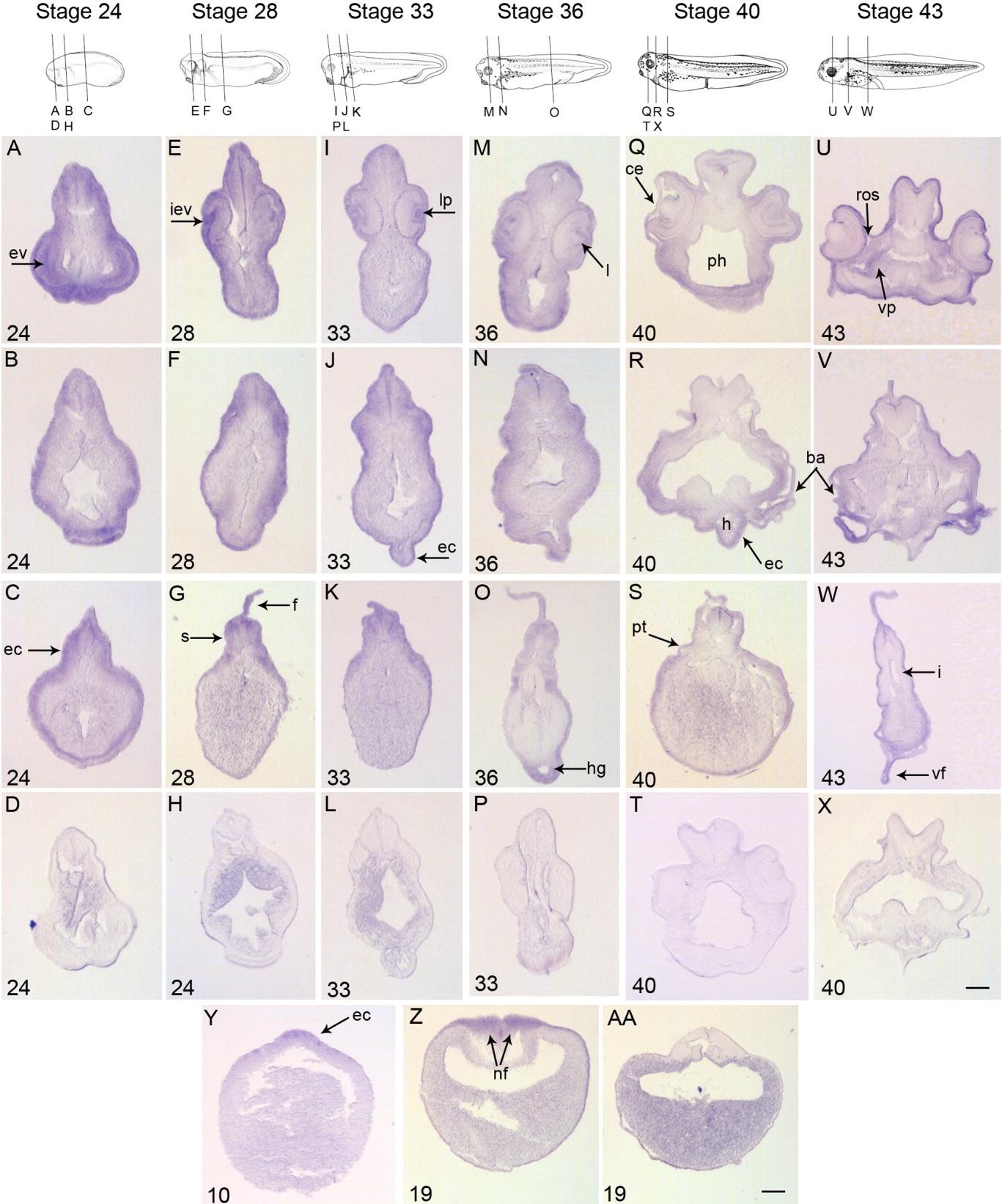 Figure 3. xWnt6 mRNA is localized within epithelial tissues and developing organs. A-C,E-G,I-K,M-O,Q-S,U-W,Y,Z: Cross-sections of embryos hybridized with a digoxigenin-labeled xWnt6-specific LNA probe. D,H,L,P,T,X,AA: Cross-sections of embryos hybridized with a digoxigenin-labeled nonspecific LNA control probe. Numerical figures indicate developmental stage. ba, branchial arches; ce, corneal epithelium; e, eye; ec, ectoderm; ev, eye vesicle, f, fin; h, heart; hg, hindgut; i, intestine; iev, invaginating eye vesicle; l, lens; lp, lens placode; nf, neural folds; p, pharynx; pt, pronephric tubules; s, somite; vf, ventral fin; vp, velar plate. Scale bars = 200 mu m. |