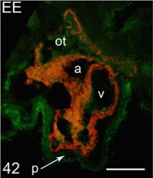Tnnt2 (troponin T type 2 (cardiac)) gene expression in Xenopus laevis embryos, NF stage 42, as assayed by immunohistochemistry (red channel). Frontal Section, dorsal up. Red channel Lateral view: anterior left, dorsal up.