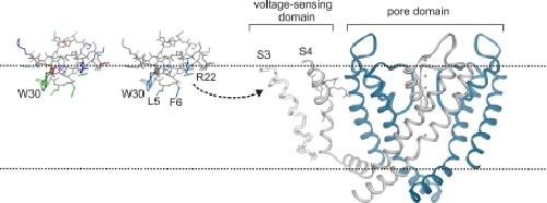 Tarantula toxins interact with voltage sensors within lipid membranes.