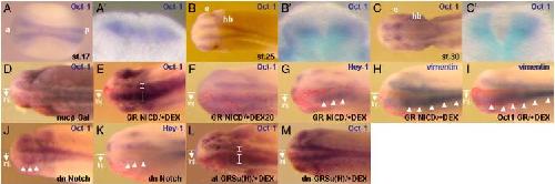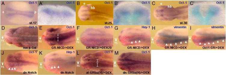 Fig. 5. Notch signaling regulates the expression of Oct-1. AâC: the expression profile of Oct-1 in Xenopus embryo. All panels are dorsal views, anterior toward left. A: stage 17, late neurula. B: stage 25, early tailbud. C: stage 30, tailbud. Aâ²âCâ²: transversal sections cut at the level of prospective hindbrain or hindbrain in panels AâC, respectively. a: anterior, p: posterior, e: eye, hb: hindbrain. DâM: whole-mount in situ hybridization analysis at stage 25. Oct-1 expression is expanded in the GR-NICD-injected (E: n = 33/45) and at-GRSu(H)-injected (L: n = 26/26) side of the brain indicated by a brace and reduced in the dn-Notch-injected (J: n = 17/30) but not dn-GRSu(H)-injected (M: n = 32/32) side of the brain. The activation of Notch at stage 20 did not expand the Oct-1 expression (F: n = 30/30). On the hand, the XHey-1 expression was increased or reduced by GR-NICD activated at stage 18 (G: n = 36/40) or dn-Notch (K: n = 30/42), respectively. The expression of vimentin was increased by GR-NICD (H: n = 32/39) and Oct1-GR (I: n = 34/40) activated at stage 18. The injected side in each embryo is indicated by nucβ-Gal staining (red color). The Oct-1 expression is not changed by injection of nucβ-Gal (D: n = 47/47).