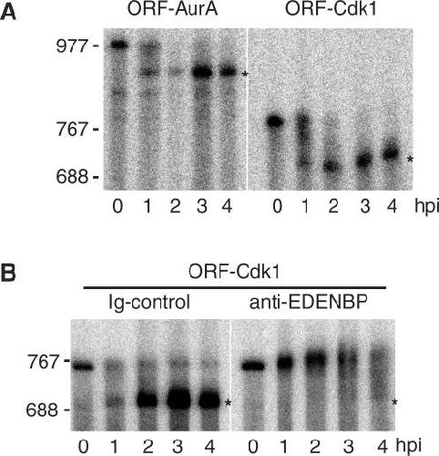 Figure 5. Cdk1 3′ UTR target a reporter mRNA for EDEN-BP-dependent deadenylation in Xenopus embryos. (A) The indicated capped poly(A)+ and radiolabeled mRNAs (ORF-Cdk1, ORF-AurA) were injected into two-cell embryos and samples were harvested at the indicated time after injection (hpi). Total RNA were extracted and separated by denaturing polyacrylamide gel electrophoresis. Radiolabeled RNAs were revealed by Phosphorimaging. For ORF-Cdk1, one can observe a small smiling of the gel. (B) ORF-Cdk1 mRNA was coinjected with either αE2 (antiEDEN-BP) antibody or control IgG as indicated. Samples were harvested at the indicated time after injection. Radiolabeled RNAs were analyzed as described for A). RNA size markers are positioned on the left side of the panel. The asterisk (*) denote the position of the poly(A)− mRNAs.