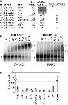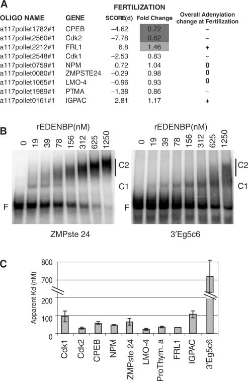 Figure 3. EMSA for eight new EDEN-BP target mRNAs. (A) Based on the study by Graindorge et al. (34), inferred adenylation changes for the RNA tested in bandshift. (−) Indicates a decrease and (+) indicates an increase in the poly(A)+ signal of at least 10% after fertilization for the indicated RNA. 0 Indicates an absence of adenylation change. (B) Two representative EMSA with recombinant EDEN-BP and the indicated RNAs are shown; 3′ Eg5C6 is a negative control and ZMPste 24 is a new EDEN-BP target RNA. C1 and C2 indicates the two different complexes formed by multimerization of EDEN-BP, F indicates the free probe, the rEDEN-BP concentrations are indicated on top of each lane. (C) Apparent Kd (nanomolar) and standard deviation was calculated from three different EMSA experiments for each of the indicated RNAs.
