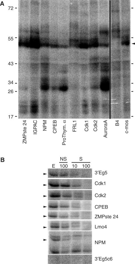 Figure 4. Binding of endogenous EDEN-BP protein to newly identified target RNAs. The indicated RNAs were tested for their ability to bind endogenous EDEN-BP protein by UV crosslinking. (A) The radiolabeled proteins were separated by SDS–PAGE and revealed using a Phosphorimager. (B) UV-crosslinking experiment in presence of specific (S) or non-specific (NS) unlabeled competitor. E corresponds to extract only, NS 100 corresponds to a binding realized in presence of 100-fold excess of non-specific competitor (3′ Eg5C6), S10 and S100 correspond to binding realized in the presence, respectively, of 10- and 100-fold excess of EDEN-BP-specific competitor (3′ Eg5). The arrowhead indicates the EDEN-BP position.