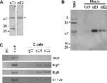 Figure 1. EDEN-BP antibodies and IP specificities. (A) αE1- and αE2-purified polyclonal antibodies were used to detect endogenous EDEN-BP in crude UFE extracts. Protein size (kiloDalton) are indicated on the left side of the panel. The arrowhead indicates EDEN-BP. (B) Western blot analysis of EDEN-BP/RNA complexes immunopurified from UFE extract with control IgG, αE1 or αE2 antibodies as indicated. Input indicates initial sample (1/7.5). Detection is realized with a guinea pig antibody raised against recombinant EDEN-BP. (C) Detection by RT-PCR of the mRNA recovered from the IP eluates presented in B. The tested mRNAs are indicated on the right of the panel. Input is the original UFE extract and RT− corresponds to control reaction with input RNA and no reverse transcriptase.