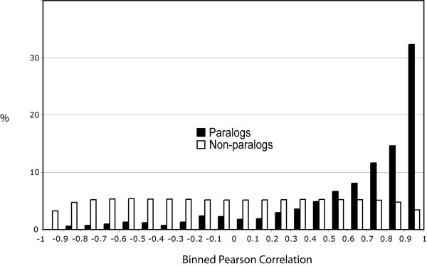 Figure 4. Binned expression profile correlations between 841 pairs of paralogs over five developmental stages or adult tissue types in the medium specificity analysis. The proportion of Pearson correlation coefficients between non-paralogous expression profiles (white bars) and between paralogous expression profiles (black bars). Ninety percent of the non-paralogous expression profiles have a Pearson correlation coefficient that is greater than -0.861 but less than 0.865. The Pearson correlation coefficients of 62% of the paralogous expression profiles are less than 0.865, and 0.3% of them are less than -0.861.