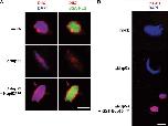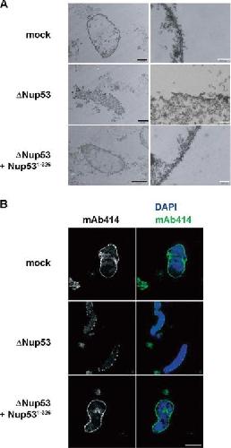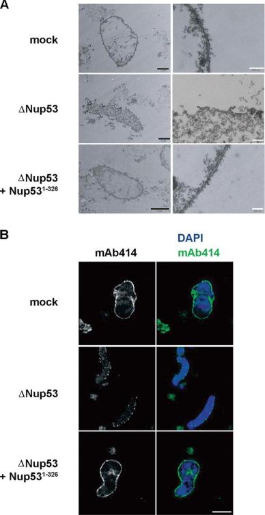 Figure 5. Depletion of Nup53 from cytosol blocks NPC assembly. (A) Transmission electron microscopy of nuclear assembly reactions of Mock, ÎNup53 extracts, or ÎNup53 extracts after addition of full-length Nup53. Black bar, 2 μm; white bar, 210 nm. (B) Nuclear assembly reactions of Mock, ÎNup53 extracts, or ÎNup53 extracts after addition of full-length Nup53. Reactions were analyzed by immunofluorescence against mAb414 (green). Chromatin was stained with DAPI (blue). Bar, 10 μm.