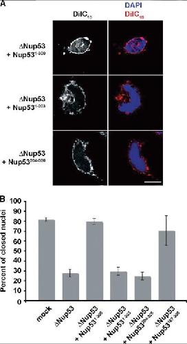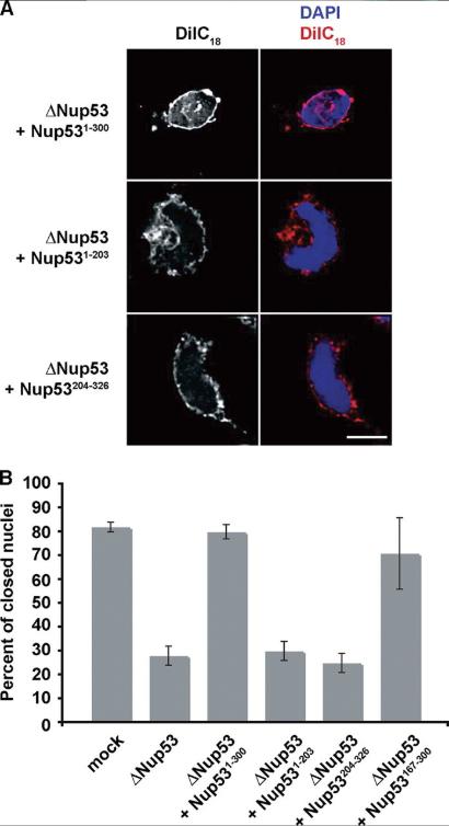 Figure 7. Nup53 fragments that interact with NDC1 or Nup93 alone are not sufficient to restore NE formation. (A) Nuclei assembled in vitro in Mock, ÎNup53 extracts, or ÎNup53 extracts after addition of Nup531-300, Nup531-203, and Nup53204-326. Membranes are visualized by using the membrane dye DilC18 (red). Chromatin was stained with DAPI (blue). Bar, 10 μm. (B) Quantitation of closed NE formation of experiments performed as described in A, including the truncation fragment Nup53167-300. More than 100 randomly chosen chromatin substrates per reaction were counted. Average of three independent experiments is shown. Error bars represent the SD over the three experiments