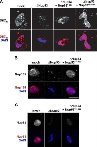 Figure 8. A Nup53 fragment that interacts with Nup155 is sufficient to restore NE formation. (A) Nuclei assembled in vitro in Mock, ÎNup53 extracts, or ÎNup53 extracts after addition of full-length Nup53, and the Nup53167-300 fragment. Maximum intensity projections of three-dimensional stack are shown. Membranes are visualized by using the membrane dye DilC18 (red). Chromatin was stained with DAPI (blue). (B) Nuclei assembled as described in A were analyzed by immunofluorescence by using Nup155 antibodies (red). Chromatin was stained with DAPI (blue). (C) Nuclei assembled as in A and B were analyzed by immunofluorescence using Nup93 antibodies (red). Chromatin was stained with DAPI (blue). Bar, 10 μm.