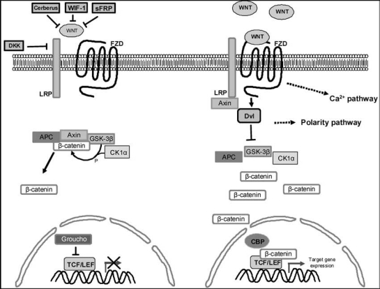 Figure 1. Schematic overview of the Wnt signaling pathways. In the absence of active Wnt (left) β-catenin is degraded and Tcf/Lef transcription factors act as repressor. When a Wnt signal is present (right) β-catenin accumulates in the cytoplasm, localizes then to the nucleus, and activates transcription together with Tcf/Lef transcription factors. |
