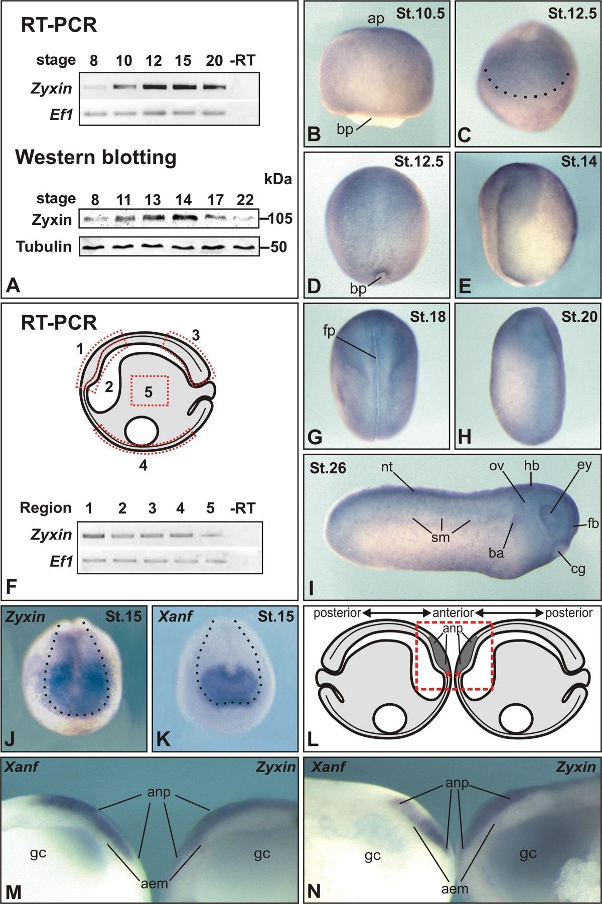 Figure 2. Expression of Zyxin during X. laevis development. A: Top: RT-PCR of total RNA from embryos at the indicated stages with primers to cDNAs of Zyxin and Ef1-alpha (Ef1) as a loading control. Bottom: Immunoblotting with Rabbit polyclonal anti-Zyxin (final dilution 1:300) and anti-tubulin antibodies (DM1A, Sigma, final dilution 1:10,000) as a loading control and detected with SuperSignal West Femto Trial Kit. B-E: Expression of Zyxin mRNA revealed by whole-mount in situ hybridization. B: Early gastrula. Lateral view, anterior to the right. C: Late gastrula. Anterior view, dorsal to the top. D: Late gastrula. Dorsal view, anterior to the top. E: Middle neurula. Dorsal and lateral view from the right side, anterior to the top. F: Region-specific RT-PCR (for Zyxin and Ef1) of total RNA from tissue explants extirpated at the middle neurula stage (stage 14) from regions indicated by red dotted lines: 1, anterior neural plate; 2, headendomesoderm; 3, trunk neural plate along with underlying axial mesoderm; 4, ventralectoderm; 5, endoderm. G: Late neurula. Dorsal view, anterior to the top. H: The end of neurulation. Lateral view from the left side. Anterior to the top. I: Tailbud stage. Dorsal to the top. Anterior to the right. J,K: Expression of Zyxin and Xanf1 mRNA, respectively, at the middle neurula stage. Anterior view, dorsal side to the top. L: Scheme of sections shown on L and M. Two halves of the same embryo were hybridized separately with Xanf1 and Zyxin probe and then compared. Red asterisk indicates anterior margin of the neural plate. M,N: Expression of Xanf1 and Zyxin mRNA at the early (stage 13) and middle (stage 15) neurula stage, as seen in two bilateral halves of the same embryo (see text for details). Neural plate margins on C, J, and K are marked with dotted line. aem, anteriorendomesoderm; anp, anterior neural plate; ap, animal pole; ba, branchial arches; bp, blastopore; cg, cement gland; fb, forebrain; fp, floor plate; gc, gastrocoel; hb, hindbrain; ey, eye; nt, neural tube; ov, otic vesicle; sm, somites.