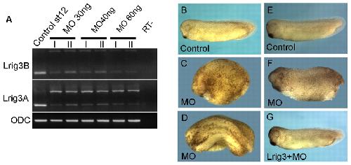 Fig. 2. Suppression of Lrig3 by a splicing morpholino disturbed embryonic development. (A) RT-PCR shows that injection of L3MO decreased the mature Lrig3 mRNA while inducing the predicted â¼1 kb unspliced band, using intron-spanning primers for pseudoalleles Lrig3A and Lrig3B. ODC was loading control. (B-D) Phenotypes induced by L3MO. The morphants showed severe anterior defects, delayed or failed neural fold closure, and shortened axis. (C,D) Embryos were injected with 30 ng L3MO; uninjected control in B. (E-G) The phenotype was rescued by co-injection of Lrig3 mRNA. (E) Uninjected control; (F) L3MO (30 ng); (G) 30 ng of L3MO plus 20 pg Lrig3 mRNA. |