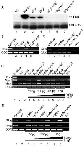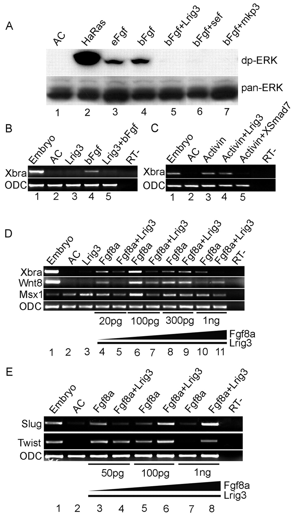 Fig. 6. Lrig3 attenuates Fgf signaling. (A) Lrig3 inhibited ERK phosphorylation. Embryos were injected with active Ras (HaRas, 100 pg), eFgf (1 pg), Lrig3 (1 ng), zebrafish sef (500 pg) or mkp3 (500 pg). Animal caps were treated with bFgf (20 ng/ml) for 3 hours as indicated. Cell lysates were analyzed for diphosphorylated (dp)-ERK and total (pan)-ERK. AC, untreated. (B) Overexpression of Lrig3 inhibits Xbra induction by bFgf. Animal caps were treated with bFgf (50 ng/ml) for 4 hours. Xbra expression was induced by bFgf treatment in uninjected (lane 4), but not in Lrig3 (1 ng) injected caps (lane 5). (C) Lrig3 did not attenuate Xbra expression induced by activin (250 pM). Injection of Smad7 (500 pg), but not of Lrig3 (1 ng), inhibited Xbra induction. (D) Lrig3 inhibits Fgf8 activity in animal caps. Embryos were injected with the indicated dose of Fgf8a alone or with 1 ng of Lrig3. Expression of Xbra, Xwnt8 and Xmsx1 was examined at equivalent stage 11.5. (E) Differential effect of Lrig3 on Slug and Twist induction by different doses of Fgf8a. Fgf8a at increasing doses, as indicated, was injected alone or with a constant amount (1 ng) of Lrig3, and induction of Slug and Twist was assayed at equivalent stage 22. |