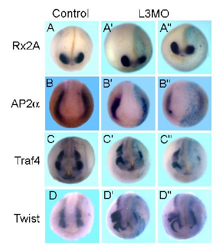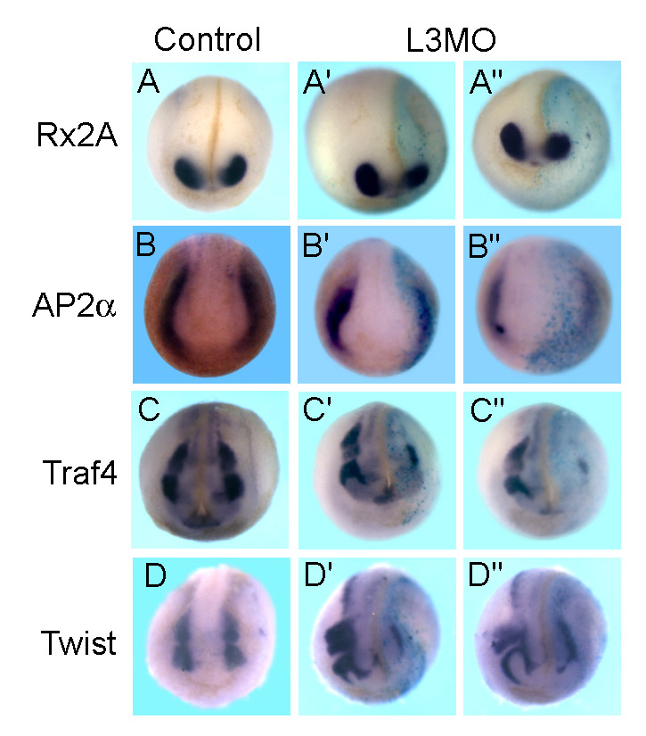 Fig. S3. Depletion of Lrig3 by L3MO inhibited NC formation. Embryos were injected with 15 ng L3MO into one dorsal blastomere at the four-cell stage. The expression of the retinal marker Rx2A (A-Aâ²â²) and the NC markers Ap2a (B-Bâ²â²), Traf4 (C-Câ²â²) and Twist (D-Dâ²â²) was examined at the late neurula stage; the injection side was visualized by lacZ staining. Rx2a was modestly decreased on the injected side (48%, 13 of 27 embryos). Traf4 (80%, 16 of 20), Twist (83%, 25 of 30), and Ap2a (80%, 16 of 20) were strongly inhibited. |