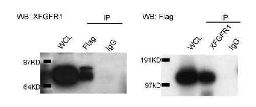 Fig. S7. Interaction between Xfgfr1 and Lrig3 were examined by co-immunopriciptation (IP). HEK293T cells were co-transfected with Xfgfr1 and Lrig3-Flag, lysed and immunopriciptated with anti-Flag antibody (M2), anti-XFGFR1 antibody or mouse IgG. Xfgfr1 was detected after IP with anti-Flag (left gel), while Lrig3-Flag was detected after IP with anti-Xfgfr1 (right gel). WCL, whole cell lysate. |