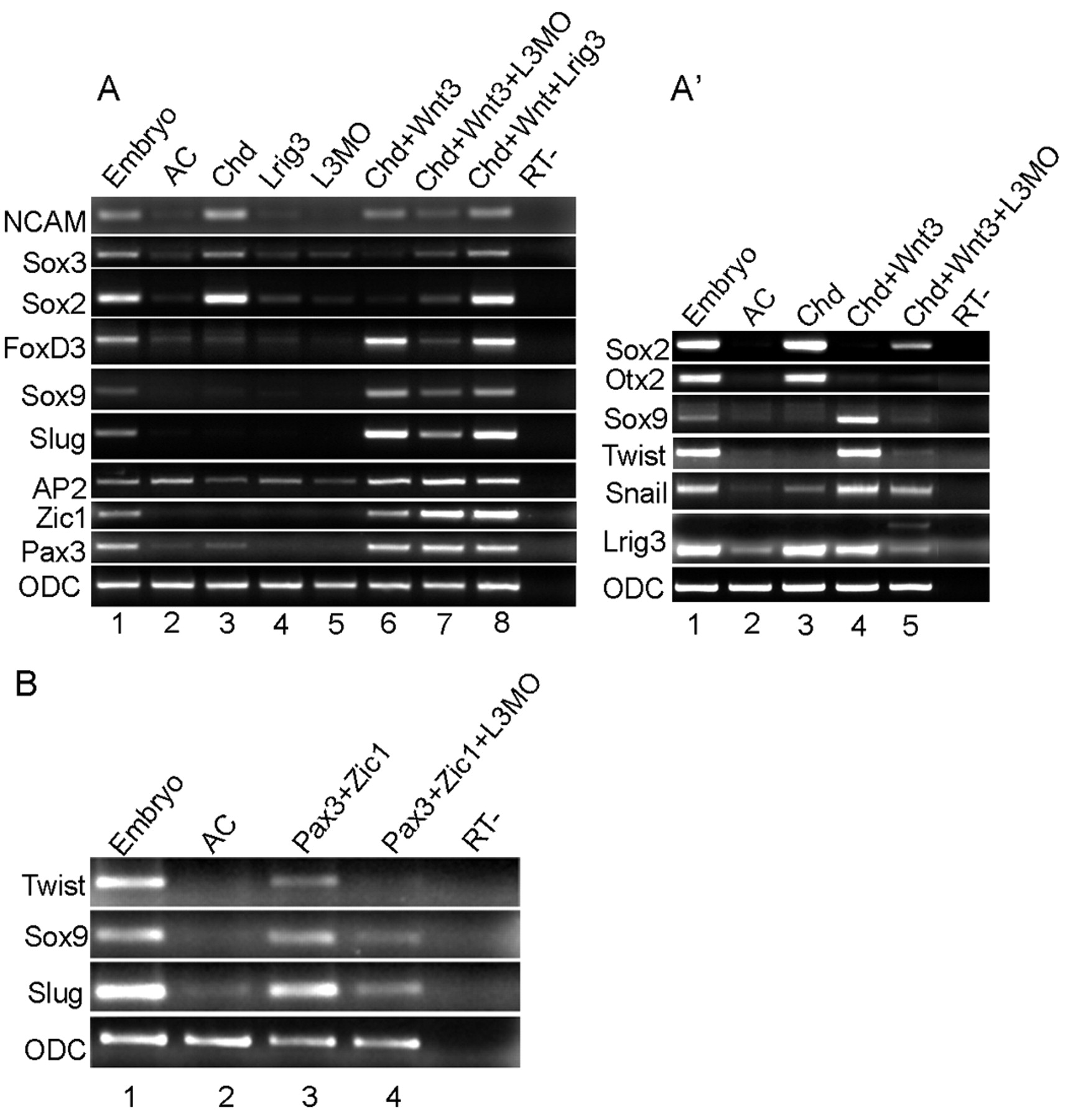 Fig. 4. Lrig3 is required for NC formation in animal caps downstream of Pax3 and Zic1. (A,Aâ²) L3MO inhibits NC marker induction by Chordin (Chd) plus Wnt3a in animal caps. Embryos were injected with 300 pg Chd, 1 ng Lrig3, 30 ng L3MO, 300 pg Chd + 300 pg Wnt3a, 300 pg Chd + 300 pg Wnt3a + 30 ng L3MO, or with 300 pg Wnt3a + 300 pg Chd +1 ng Lrig3. Gene expression was assayed by RT-PCR. (B) NC induced by co-injection of Pax3 and Zic1 was inhibited by L3MO. Pax3 (200 pg) and Zic1 (200 pg) each, alone or with 30 ng L3MO were injected, and assayed as in A. AC, uninjected animal caps. RT-, without reverse transcriptase. |