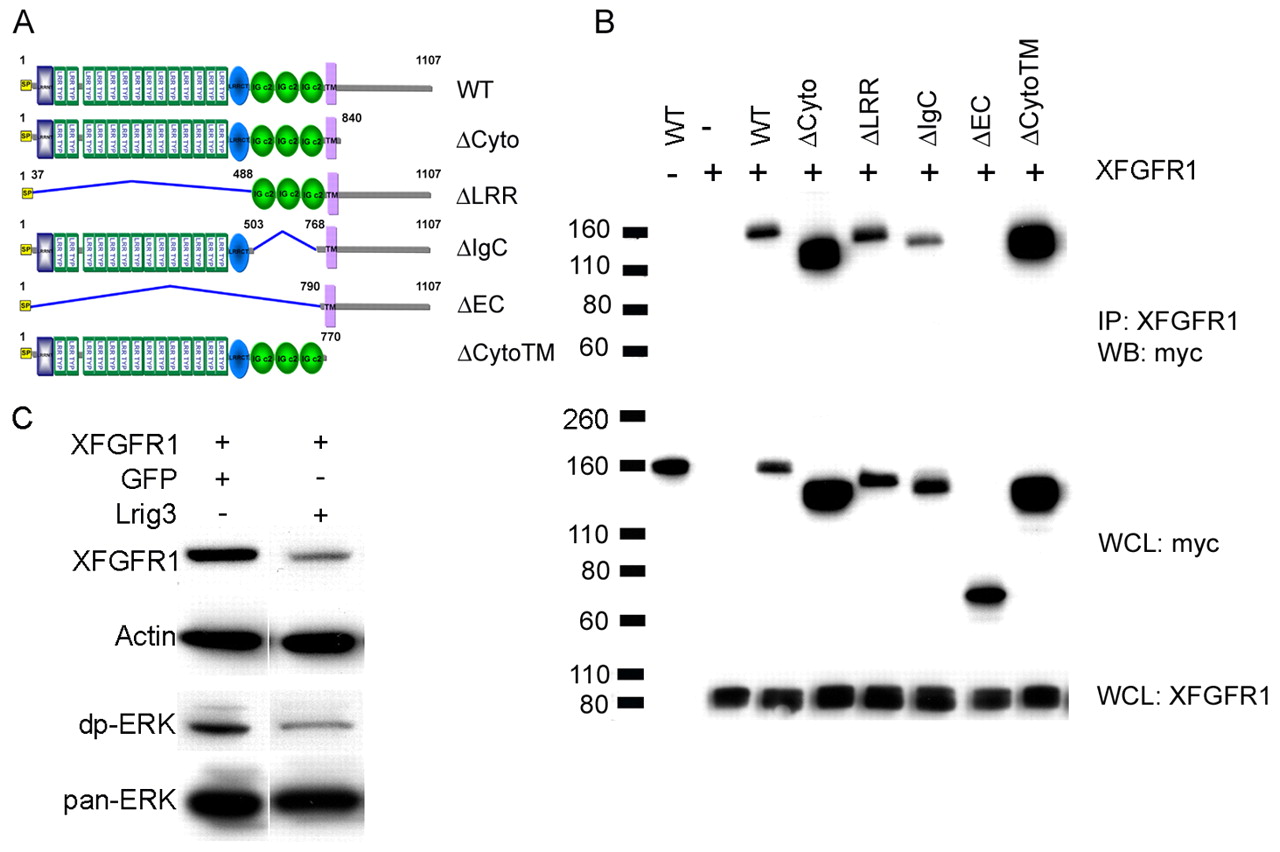 Fig. 7. Lrig3-Xfgfr1 interactions. (A) The domain structure of wild-type Lrig3 and its deletion mutants; all constructs were tagged with Myc. LRRNT (blue box), leucine-rich repeat N-terminal domain; LRR TYP, leucine-rich repeats, typical; LRRCT (blue oval), leucine-rich repeat C-terminal domain; IG C2 (green oval), immunoglobulin C-2 Type; SP (yellow), signal peptide;. TM (purple), transmembrane domain. (B) Lrig3 binds to Xfgfr1 through its ectodomains. Co-immunoprecipitation was carried out in extracts of 293T cells co-transfected with Xfgfr1 and wild type or mutants of Lrig3 using anti-Xfgfr1 antibody, and blotted with anti-Myc antibody. (C) Lrig3 decreases Xfgfr1 levels. 293T cells were co-transfected with Xfgfr1 and Lrig3 or GFP, which was used to adjust the amount of DNA. Xfgfr1 and endogenous diphospho-ERK and Pan-ERK were detected by western blotting. Actin was employed as a loading control. IP, immunoprecipitate; WCL, whole cell lysate; WB, western blot. |
