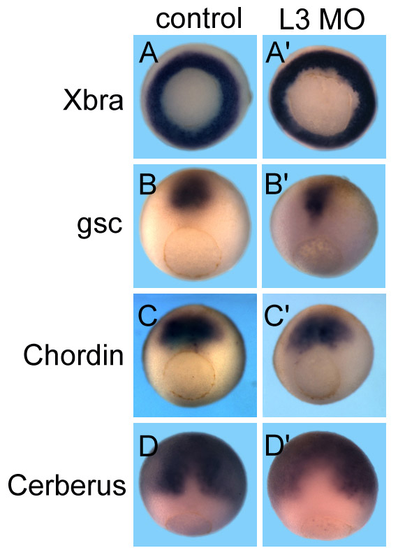 Fig. S4. Mesoderm formation was not substantially affected by L3MO. The mesoderm markers Xbra, Chordin, Goosecoid (Gsc), and Cerberus were examined by whole-mount in situ hybridization at stage 11 in embryos injected dorsally at the four-cell stage with 30 ng L3MO. |