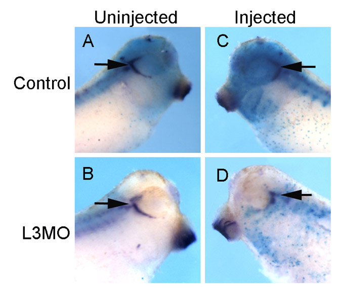 Fig. S5. Injection of L3MO inhibited trigerminal nerve formation. One dorsal blastomere of 4-cell stage embryos was injected with either control MO (A,C) or L3MO (B,D), and allowed to develop to stage 35. Two branches of the trigeminal nerve, the ophthalmic and mandibular, were visualized by whole-mount in situ hybridization with Synuclein γ. The expression of Synuclein γ was reduced on the Lrig3-depleted side (77%, 20 of 26 embryos), while embryos injected with control MO showed normal expression (92%, 12 of 13). |