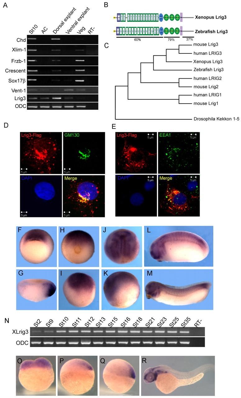 Fig. 1. Characterization of the Lrig3 gene. (A) Regional expression of Lrig3 in stage 10 embryos. Lrig3 was expressed strongly in dorsal explants, but barely detected in other regions. The indicated genes were assayed to test quality of dissection. St10, stage 10 embryo; AC, animal cap; Veg, vegetal explant; RT-, control without reverse transcriptase. (B) Schematic drawing of the protein structure of Xenopus and zebrafish Lrig3. SP (yellow), signal peptide; LRRNT (blue box), leucine-rich repeat N-terminal domain; LRR TYP, leucine-rich repeats, typical; LRR, leucine-rich repeats; LRRCT (blue oval), leucine rich repeat C-terminal domain; IG C2 (green oval), immunoglobulin C-2 Type; TM (purple), transmembrane domain. Sequence identity between zebrafish and Xenopus Lrig3 is indicated. (C) Dendrogram of the Lrig3 family including Kekkon of Drosophila. (D,E) Subcellular distribution of Lrig3 after transfection into COS7 cells. (D) Transfected Lrig3-Flag (red) co-localized with the cis Golgi apparatus marker GM130 (green); the nucleus was stained with DAPI (blue). (E) A small proportion of Lrig3-Flag co-localized with the early endosome marker EEA1 (green). (F-M) Expression pattern of Lrig3 in Xenopus. Vegetal view at stage 10, expression in the organizer (F); stage 10 section (G). (H,I) Stage 12 (H, posterior view; I, lateral view). (J,K) Stage 15 (J, dorsal view; K, lateral view). Tailbud (stage 24, L) and tadpole (stage 32, M); expression is seen in brain, eye, somites and branchial arches. (N) Temporal expression of Lrig3 during Xenopus development. (O-R) Expression of lrig3 in zebrafish. Transcripts are present maternally (O), become localized in the forming organizer at 30% epibody (P) and subsequently in the shield (Q), and were found in brain, eye and branchial arches at 24 hours (R). (P-R) Lateral views. |