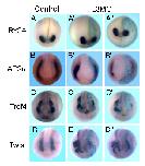 Fig. 3. Knockdown of Lrig3 results in defects of the NC and its derivatives. (A-Fâ²) In situ hybridization with the indicated markers for uninjected or two examples (â²,â²) of L3MO-injected embryos. One dorsal blastomere at the four-cell stage was injected with 15 ng L3MO and 100 pg lacZ mRNA, and fixed at about stage 19. The expression of hindbrain marker Krox20 (rhombomeres 3 and 5) (A-Aâ²), NC markers Slug (B-Bâ²), Sox9 (C-Câ²), Myc (D-Dâ²) and Inca (E-Eâ²), and pan-neural marker Sox2 (F-Fâ²) were examined. The injected side was traced by lacZ staining. The stream of Krox20-positive cells extending from the hindbrain was absent in 97% (28 of 29 embryos) on the injected side. The expression of NC markers was reduced on the injected side in the following percentage of embryos: Slug (58%, 14 of 24), Sox9 (79%, 15 of 19), Myc (83%, 20 of 24) and Inca (65%, 17 of 26). (G) Neural induction by overexpression of Chordin (Chd) in animal caps was barely affected by L3MO. Chd (100 pg) or Chd (100 pg) plus L3MO (30 ng) were injected, caps dissected at stage 9, and assayed at equivalent stage 22. Pan neural markers Sox2 and Ncam were examined, and interference with Lrig3 splicing was verified (see also Fig. 2A); arrow indicates the predicted unspliced band (lane 4). (H-Jâ²) NC markers, including Slug, Inca and Sox9, were examined in embryos injected with 7.5 ng L3MO in one animal dorsal blastomere at the eight-cell stage. Strong inhibition was observed for Slug (95%, 18 of 19), Inca (89%, 24 of 27) and Sox9 (73%, 19 of 26). (K-M) Cranial cartilages were reduced by knockdown of Lrig3. Ventral views of Alcian Blue stained cartilage from embryos injected with control morpholino (K) or L3MO (L,M). ba, basihyal; br, branchial; ch, ceratohyal; m, Meckel's. Percentages of embryos with reduced head cartilage are 82% (38 of 47) at 7.5 ng L3MO and 97% (31 of 32) at 15 ng L3MO. (N-P) Rescue of L3MO effect. All embryos were injected with 15 ng L3MO, and embryos in N-Oâ² were co-injected with 20 pg Lrig3 mRNA; in situ hybridization with Inca (N-Nâ²) and Slug (O-Oâ²). Percentages of strongly affected (examples in N,O), mildly affected (Nâ²,Oâ²) and normal (Nâ²,Oâ²) are shown in P. |