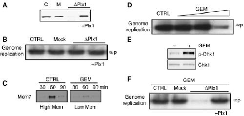 Figure 1. Effects of Plx1 depletion on DNA replication. (A) Immunodepletion of Plx1. Western blot analysis with anti-Plx1 antibodies of control (C) mock-depleted (M), Plx1-depleted (ΔPlx1) and Plx1-depleted extracts reconstituted with 6 ng/μl recombinant Plx1 (+Plx1). (B) Replication assay in unchallenged extracts. Extracts supplemented with 2000 nuclei/μl were untreated (CTRL), mock depleted (Mock), Plx1 depleted (ΔPlx1) and Plx1 depleted and supplemented with recombinant Plx1 (+Plx1). DNA was replicated in the presence of [α-32P]dATP for 120 min, extracted and separated on an agarose gel. The gel shown represents a typical result. (C) Chromatin binding of Mcm7. Sperm nuclei were replicated in untreated extracts (CTRL) and extracts supplemented with a low concentration (40 nM) of geminin (GEM). Chromatin was isolated at the indicated time points and separated on SDS–PAGE. Western blots were performed with antibodies against human Mcm7. (D) Effects of geminin on DNA replication. Extracts were supplemented with increasing concentrations of geminin (40, 60 and 120 nM). (E) Phosphorylation of Chk1 serine 345 (p-CHK1) in extracts supplemented with 7000 nuclei/μl. Extracts were untreated (−) or supplemented (+) with 40 nM geminin (GEM). Western blot was performed with anti-phospho-serine 345 of human Chk1 (p-Chk1) and anti-Chk1. Chk1 phosphorylation induced by geminin was detected with ECL plus reagent (see Materials and methods). (F) Replication assay in extracts supplemented with 40 nM geminin (GEM) in the presence of 7000 nuclei/μl. Extracts were untreated (CTRL), mock depleted (Mock), Plx1 depleted (ΔPlx1) and Plx1 depleted and supplemented with recombinant Plx1 (Plx1-dep+Plx1). The gel shown represents a typical result.