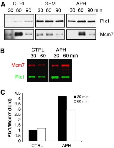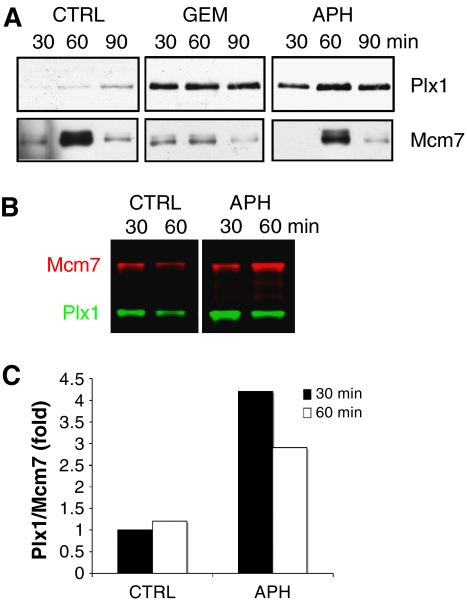 Figure 2. Plx1 binding to chromatin is enhanced in the presence of stalled replication forks. (A) Chromatin binding of Plx1 and Mcm7 to chromatin 30, 60 and 90 min after nuclei addition to untreated extracts (CTRL) and extracts treated with geminin (GEM) or 5 μM aphidicolin (APH). (B) Chromatin binding of Plx1 after aphidicolin treatment. Extracts were untreated (CTRL) or treated with 5 μM aphidicolin (APH) before the addition of sperm nuclei. Chromatin-bound proteins were separated on SDS–PAGE, transferred to nitrocellulose and probed for Mcm7 and Plx1, which were visualized with infrared dye-labelled secondary antibodies. (C) Quantification of chromatin-bound Plx1 at 30 and 60 min after nuclei addition to untreated (CTRL) or aphidicolin (APH)-treated extracts. Chromatin-bound proteins were quantified with an infrared imager and the ratio of Plx1 to Mcm7 was plotted. The ratio Plx1 to Mcm7 in the untreated sample (CTRL) was considered as the reference value.