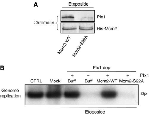 Figure 6. Mcm2 serine 92 phosphorylation is required for Plx1 function. (A) Chromatin binding of Plx1 in the presence of Mcm2-WT and Mcm2-S92A proteins. Sperm nuclei were incubated for 60 min in extracts supplemented with 200 ng/μl recombinant histidine-tagged Mcm2-WT and Mcm2-S92A proteins in the presence of 5 μM etoposide. Chromatin was isolated and subjected to western blot analysis with anti-Plx1 (Plx1) and anti-histidine (His-Mcm2) antibodies. (B) DNA replication under stress in Plx1-depleted extracts in the presence of Mcm2-WT and Mcm2-S92A proteins. Sperm nuclei (7000 nuclei/μl) were replicated in extracts that were untreated (CTRL), mock depleted (Mock) or Plx1 depleted (ΔPlx1) in the presence of 5 μM etoposide. Extracts were supplemented with buffer (Buff), 200 ng/μl Mcm2-WT or 200 ng/μl Mcm-S92A proteins. Plx1-depleted extracts were also supplemented with 6 ng/μl recombinant Plx1, as indicated.