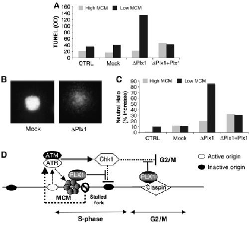 Figure 7. Plx1 prevents chromosomal breakage during DNA replication. (A) DNA breaks detected with the TUNEL assay. Egg extract was left untreated (CTRL), mock depleted (Mock), Plx1 depleted (ΔPlx1) or Plx1 depleted and supplemented with recombinant Plx1 (ΔPlx1 dep+Plx1). DNA replication was obtained in the absence (grey bar) or presence of 40 nM geminin (black bar). Sperm nuclei were replicated for 90 min, chromatin was isolated and TUNEL assay was performed in the presence of [α-32P]dATP. The DNA was isolated, precipitated and separated on an agarose gel. Incorporated 32P was quantified with the PhosphoImager and optical density (OD) was plotted. (B) Typical image of a nucleus processed with the neutral comet assay from mock-depleted extract (Mock) and from Plx1-depleted extract (ΔPlx1). (C) Quantification of DSBs. Untreated extracts (grey) and extracts supplemented with geminin (black) were left untreated (CTRL), mock depleted (Mock), Plx1 depleted (ΔPlx1) or Plx1 depleted and supplemented with recombinant Plx1 (ΔPlx1+Plx1). The percentage increase in the head length of the comets subtracted from the average nuclear diameter of undepleted samples with high Mcm was used as a parameter to measure DSBs. (D) Model representing the function of Plx1 in DNA replication under stressful conditions. In the presence of stalled replication forks, the ATR/ATM-dependent checkpoint activation promotes Plx1 binding to the Mcm complex close to stalled forks and attenuates the inhibitory activity of the checkpoint towards unfired origins. Activation of the supplementary origins overcomes the stalled replication forks. Claspin-dependent recruitment of Plx1 suppresses the checkpoint that controls mitosis onset in the presence of unreplicated DNA.