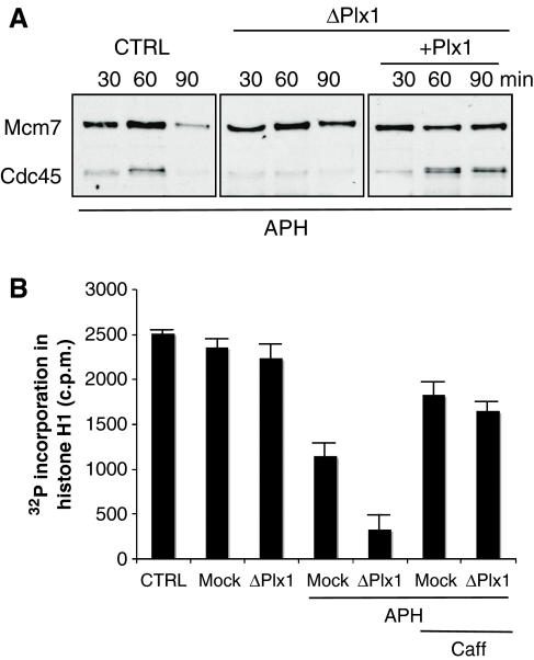 Figure 4. Plx1 deficiency affects Cdc45 loading and Cdk2 activity in the presence of stalled replication forks. (A) Cdc45 and Mcm7 binding to chromatin isolated from extracts that were untreated (CTRL), Plx1 depleted (ΔPlx1) or Plx1 depleted and reconstituted with recombinant Plx1 (+Plx1). All extracts were supplemented with aphidicolin. (B) Nuclear Cdk2 activity measured by monitoring 32P incorporation in histone H1 after immunoprecipitating nuclear Cdk2 with anti-Xenopus Cdk2 antibodies from extracts that were untreated (CTRL), mock depleted (Mock) or Plx1 depleted (ΔPlx1) and treated with and without 50 μM aphidicolin (APH) or 5 mM caffeine (Caff), as indicated.
