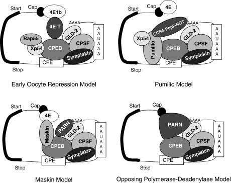 Elongation of the poly(A) tails of specific mRNAs in the cytoplasm is a crucial regulatory step in oogenesis and early development of many animal species. The best studied example is the regulation of translation by cytoplasmic polyadenylation elements (CPEs) in the 3' untranslated region of mRNAs involved in Xenopus oocyte maturation. In this review we discuss the mechanism of translational control by the CPE binding protein (CPEB) in Xenopus oocytes as follows: 1. The cytoplasmic polyadenylation machinery such as CPEB, the subunits of cleavage and polyadenylation specificity factor (CPSF), symplekin, Gld-2 and poly(A) polymerase (PAP). 2. The signal transduction that leads to the activation of CPE-mediated polyadenylation during oocyte maturation, including the potential roles of kinases such as MAPK, Aurora A, CamKII, cdk1/Ringo and cdk1/cyclin B. 3. The role of deadenylation and translational repression, including the potential involvement of PARN, CCR4/NOT, maskin, pumilio, Xp54 (Ddx6, Rck), other P-body components and isoforms of the cap binding initiation factor eIF4E. Finally we discuss some of the remaining questions regarding the mechanisms of translational regulation by cytoplasmic polyadenylation and give our view on where our knowledge is likely to be expanded in the near future.