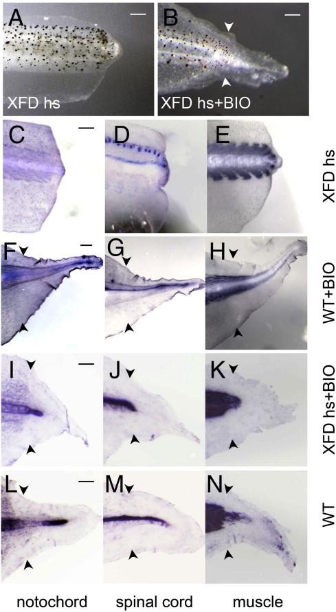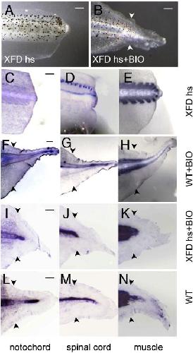 Fig. 4. Immunohistochemistry of axial structures in XFD transgenic and BIO treated tail regenerates. (A) The tail of this XFD transgenic tadpole failed to regenerate after daily heat shock treatment, 7 days post amputation. (B) XFD transgenic tadpole treated with BIO shows outgrowth of tail after amputation, 7 days post amputation. (CâN) Detection of notochord (C, F, I, L; with MZ15 antibody), spinal cord (D, G, J, M; with 2G9 antibody) and muscle (E, H, K, N; with 12/101 antibody) in heat shocked XFD transgenic tadpoles (CâE), wild type tadpoles treated with BIO (FâH), heat shocked XFD transgenic tadpoles treated with BIO (IâK) and wild type tadpoles (LâN). White and black arrowheads indicate amputation levels. Scale bars: 200 μm. For the experiments shown in panels IâN, tadpole stage was 42â43. |