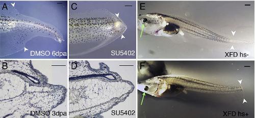 Fig. 2. Tail regeneration in tadpoles with FGF signaling inhibited. (A, C) Inhibition of FGF signaling with SU5402 blocks tail regeneration. (A) A tail regenerate of a tadpole treated with DMSO, for 6 days after amputation. (C) A tail of a tadpole treated with 100 μM SU5402, for 6 days after amputation. (B, D) HE staining of para- sagittal sections of 3 dpa DMSO treated tadpole tail (regenerating, B) and 100 μM SU5402 treated tadpole tail (non-regenerating, D). In panel D, the notochord and neural ampulla are not elongated and there is much less blastema tissue present. (E, F) Tail regeneration in XFD transgenic tadpoles without (E) or with heat shock treatment (bright field image overlay with fluorescent image, green arrows indicate green lens). Heat shock was given 3 h before tail amputation and then every 24 h after amputation. White arrowheads indicate amputation levels in panels A, C, E and F. dpa: day post amputation. Scale bars: 200 μm in panels A and 1 mm in panels E, F. |