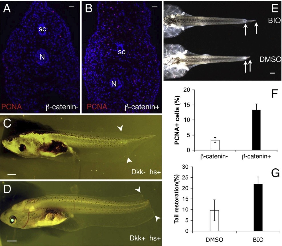 Fig. 3. Cell proliferation detection in beta-catenin transgenic tadpoles and tail regeneration in dkk1 transgenic and BIO treated tadpoles. (A, B) Cell proliferation detection with antibody against PCNA in tail regenerate of beta-catenin transgenic tadpoles with (B) or without (A) heat shock induction. Cross sections were prepared from tail regenerates 4 days post amputation. N: notochord; sc: spinal cord. (C) Tail regeneration in a wild type (siblings from dkk1 transgenic) tadpole with heat shock treatment, 7 days post amputation. (D) Tail regeneration in a dkk1 transgenic tadpole with heat shock treatment, 7 days post amputation. Heat shock was given 3 h before tail amputation and then every 24 h after amputation. Arrowheads in panels C, D indicate amputation levels. hs: heat shock. (E) Tail regeneration in tadpoles treated with BIO or DMSO, 4 days post amputation. White arrows indicate regenerating tail. (F) Quantification of PCNA positive cells in tail regenerates of β-catenin transgenic tadpoles, based on cell counting on cross sections of 3 individuals for each group. (G) Quantification of tail regeneration rate in DMSO or BIO treated tadpoles. Tail restoration rate is measured as described in materials and methods section. Scale bars in panels A, B: 50 μm; scale bars in panels C: 500 μm. |