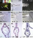 Fig. 5. Tail regeneration in dkk1+fgf20 double transgenic tadpoles. (A) A tadpole with both dkk1 transgene as indicated by the green lens (short white arrow) and fgf20 transgene as indicated by the green pancreas (long white arrow). Transgenic constructs used are shown in inset. (B) Tail regeneration in wild type tadpoles after 7 days' heat shock treatment (23 of 23 in total). (C) Tail regeneration in dkk1 transgenic tadpoles with heat shock treatment for 7 days. Most dkk1 transgenic tadpoles failed to regenerate (23 of 28), some regenerated partially (5 of 28, similar as shown in panel F). (D) Tail regeneration in dkk1 and fgf20 double transgenic tadpoles, with heat shock treatment for 7 days. (D) Full tail regeneration (18 of 52). (E) Partial tail regeneration (18 of 52). (F) Partial tail regeneration (8 of 52). Some dkk1 and fgf20 double transgenic tadpoles failed to regenerate (8 of 52, similar as in panel C). (G) Representative cross sections of tail regenerates in wild type tadpoles (G) and fully regenerated (H) or partially regenerated (I) tail in dkk1 and fgf20 double transgenic tadpoles. Cross sections were immunostained with 12/101 mAb and conterstained with Haematoxylin. N: notochord, s.c.: spinal cord. White arrowheads in panels B indicate amputation levels. Scale bars in panels A: 250 μm; scale bars in panels G: 100 μm. |