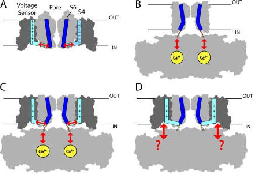 Figure 1. Proposed pathways of sensor/gate interaction for different channels. (A) Kv1.2, where the charged S4 segment (light blue) in the voltage sensor is proposed to interact with the S6 activation gate (dark blue) in the pore via the S4–S5 linker (arrows). The outlines of the S1–S4 voltage sensor domain and S5–S6 pore domain for two subunits from the Kv1.2 crystal structure (Long et al., 2005a) are shown in dark and light gray, respectively, and are truncated at S1 (protein data bank code 2A79). (B) MthK, where Ca2+ binding to the cytosolic domain is proposed to cause a conformational change that pulls open the gate through short peptide linkers (dashed lines) that are unresolved in the crystal structure (Jiang et al., 2002) (protein data bank code 1LNQ). The attachment points of the linker on the cytosolic domain (in foreground and background) have been altered to better illustrate that linkers are pulled away from the pore axis. (C) A hypothetical BK channel structure formed by appending the Kv1.2 voltage sensors to MthK shows how Ca2+ and voltage may both interact with the gate to have independent effects on activation. The position of the voltage sensors was determined by superimposing the pore domains of Kv1.2 (residues 341–406) and MthK (residues 26–91) in PyMol (http://www.pymol.org). (D) The hypothetical BK channel structure also illustrates the possibility that the large cytosolic domain may interact directly with voltage sensors. |