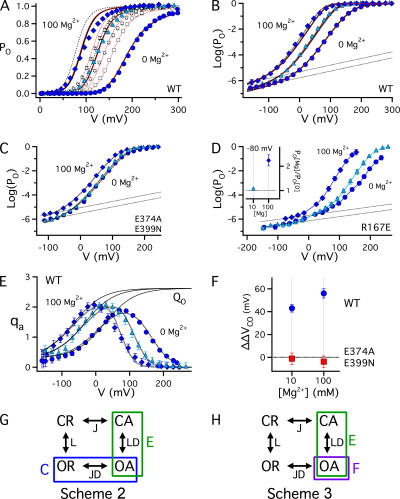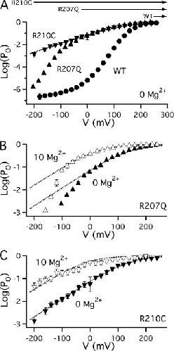 Figure 4. Mg2+ facilitates opening in a voltage-independent manner when voltage sensors are constitutively activated. (A) Mean log(PO)-V relations for WT (•), R207Q (▴), and R210C (▾) in 0 Mg2+. Arrows indicate the voltage range where voltage sensors of WT, R207Q, and R210C are fully activated (see text). Dotted curve represents a Boltzmann fit to R210C with partial charge z = 0.46e that describes the weak voltage dependence of channel opening in both mutants when voltage sensors are fully activated (Ma et al., 2006). (B) Mean log(PO)-V relations for R207Q show that 10 mM Mg2+ (▵) increases PO even when voltage sensors are fully activated. Dotted Boltzmann fits from −20 to +240 mV have identical charge (0.46e) but V0.5 is shifted by −91.6 mV in Mg2+, consistent with a 8.2-fold increase in the C-O equilibrium constant. (C) Mean log(PO)-V relations for R210C show that 10 mM Mg2+(▿) increases the C-O equilibrium constant in a voltage-independent manner when voltage sensors are constitutively activated. Boltzmann fits have identical charge (0.46e) but V0.5 is shifted by −122 mV in Mg2+, consistent with a 16.6-fold increase in the C-O equilibrium constant and a twofold increase in the allosteric coupling factor D. |
