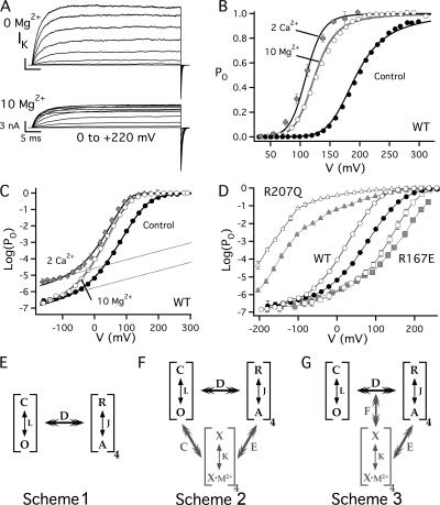 Figure 2. Effects of Mg2+ on steady-state activation. (A) Effect of 10 mM Mg2+ on macroscopic IK evoked from mSlo1 channels in response to 50-ms pulses to different voltages in 0 Ca2+ from a holding potential of −80 mV. Mg2+ decreases outward current at high voltages owing to rapid pore block. However tail currents indicate an increase in PO and slowing of channel deactivation. (B) Mean normalized GK-V relations (Po = GK/GKmax) determined from tail currents in 10 mM Mg2+(O), 2 μM Ca2+(♦) or the absence of divalent cations (control, •). (C) Mean log(PO)-V relations corresponding to B achieve a weakly voltage-dependent limiting slope at extreme negative voltages, indicating that voltage sensors are in the resting state. Dotted lines are exponential fits to control and Ca2+ data with partial charge zL = 0.3e (Ma et al., 2006). (D) Voltage sensor mutations R207Q (▵, ▴) and R167E (□, ▪) shift both the voltage dependence of activation and Mg2+ sensitivity (0 Mg: filled symbols; 10 mM Mg2+: open symbols) relative to the WT (O, •), implying that Mg2+ action depends on voltage sensor activation and is not intrinsically voltage dependent. (E) Voltage-gating mechanism (Scheme 1). Channels undergo a closed–open (C-O) conformational change that is allosterically regulated by four independent and identical voltage sensors that can undergo a resting-activated (R-A) transition. L and J are voltage-dependent equilibrium constants (L = L0exp(zLV/kT), J = J0exp(zJV/kT) = exp(zJ[V − VhC]/kT)) and D is an allosteric factor. (F) Scheme 2 includes a ligand-binding transition (X-X·M2+) in each subunit that allosterically regulates channel opening and voltage sensor activation as described by factors C and E, respectively. Solid curves in B and C represent a fit of this model to Ca2+-dependent activation in 0–100 μM Ca2+ (Horrigan and Aldrich, 2002) (VhC = 156 mV, zJ = 0.58e, L0 = 1.06 × 10−6, zL = 0.3e, KD(Ca2+) = 11 μM, C = 8, D = 24.4, E = 2.4). The same model with identical values of VhC, zJ, L0, zL, D, and E can fit the Mg2+ data (dotted curves) if Mg2+ binding is assumed to be voltage dependent (i.e., KD(Mg2+) = KD(0)exp(−Vγ2e/kT)) (KD(0) = 9.35 mM, γ = 0.2, C = 1.66) (G) Scheme 3 assumes that ligand binding allosterically regulates voltage/sensor gate coupling and voltage sensor activation as described by allosteric factors F and E, respectively. |