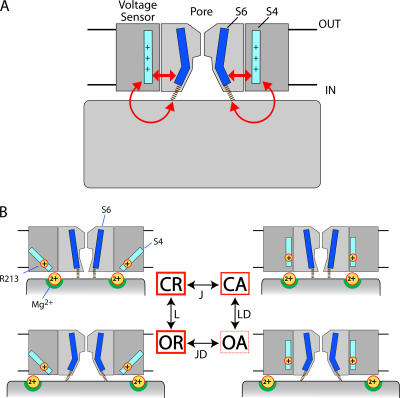 Figure 8. Voltage sensor/gate coupling and the mechanism of Mg2+ action. (A) Multiple pathways of voltage sensor/gate coupling may exist in BK channels. Because the cytosolic domain is connected to the gate via the RCK1–S6 linker (dashed line), interactions between cytosolic and voltage sensor domains could provide a coupling pathway (curved arrow) that is independent of that within the transmembrane domain (straight arrow). (B) A speculative model of Mg2+-dependent activation, based on an electrostatic mechanism of interaction between Mg2+ in the putative RCK1 binding site and R213 in S4 (Yang et al., 2007). The BK channel is shown in the four states defined in each subunit by the movement of the voltage sensor from resting (R) to activated (A) and by the closed (C) to open (O) conformational change. Channel opening is accompanied by an expansion of the cytosolic domain that alters the position of Mg2+ (in its binding site) relative to the transmembrane domain. The Mg2+ binding site (green semicircle) in the RCK1 domain includes coordinating residues E374 and E399 and nearby Q397 (Yang et al., 2006). Voltage sensor activation moves R213 relative to the cytosolic domain. In this way the distance and therefore electrostatic repulsion between Mg2+ and R213 (indicated qualitatively by the thickness of red boxes surrounding each state) depends on the conformation of both voltage sensor and gate, such that voltage sensor/gate coupling is enhanced. To account for the observed effects of Mg2+ on both opening and voltage sensor activation requires that the OA state be stabilized (see text). This is accomplished in the model by maintaining a similar distance between Mg2+ and R213 in all states except OA, such that all states are destabilized relative to OA. To account for a small effect of Mg2+ on voltage sensor activation when channels are closed we also assume interaction in the CA state is slightly weaker than the CR state, owing to a small outward movement of R213 upon voltage sensor activation, consistent with the small contribution of R213 to gating charge (Ma et al., 2006). |