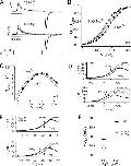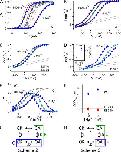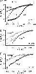 Figure 5. Effects of Mg2+ on different binding sites were determined by measuring PO for WT and mutant channels in 0–100 mM Mg2+ (0, blue circle; 2, □; 5, ▿; 10, blue triangle; 21, ; 100, blue diamond, mM Mg2+). (A) Normalized mean GK-V relations for the WT in 0–100 mM Mg2+. (B) Mean log(PO)-V relations for WT in 0, 10, and 100 mM Mg2+ reveal that 100 Mg2+ increases PO at extreme negative voltages. These plots represent the same data as in A but were averaged in 20 mV rather than 10-mV bins to match the voltage interval for low PO measurements. Dotted lines are exponential fits to PO at extreme negative voltages in 0 and 100 Mg2+ with partial charge zL = 0.3e. (C) Mean log(PO)-V relations in 0, 10, and 100 mM Mg2+ for E374A/E399N show that mutation of the putative Mg2+ site in RCK1 almost abolishes effects of 10 mM Mg2+ but leaves the PO increase by 100 Mg2+ (dotted lines) intact. (D) Mean log(PO)-V relations in 0, 10, and 100 mM Mg2+ for R167E achieve a limiting slope at more positive voltages than the WT, confirming that PO is increased by 100 Mg2+ when voltage sensors are in the resting state (dotted lines). Inset graph plots the ratio of NPO in the presence and absence of Mg2+ at −80 mV from a larger set of experiments. (E) Mean qa-V relations for the WT in 0, 10, and 100 mM Mg2+ were derived from the slope of log(PO)-V in B (see text). Solid curves are estimates of the QO-V relation determined by fitting the foot of the qa-V relation (to ∼80% of peak qa) with a function qa = zL + 4zJ [1 + exp([VhO − V]zJ/kT)]−1 where zL = 0.3e, zJ = 0.58e, and VhO = 26.5 ± 2.1, −33.6 ± 2.4, −65.6 ± 3.7 mV in 0, 10, and 100 mM Mg2+, respectively. (F) Plot of ΔΔVCO = ΔVhC − ΔVhO for 10 and 100 mM Mg2+ in WT (blue circle) and E374A/E399N (red square) channels where ΔVhO = [VhO(Mg2+) − VhO(0 Mg2+)] was estimated from the qa-V relation as in E and ΔVhC was determined from gating current (Fig. 3 F). Nonzero values of ΔΔVCO indicate that Mg2+ alters voltage sensor/gate coupling in the WT. However, effects on coupling are abolished by the E374A/E399N mutation. (G) Alternative representation of Scheme 2 (Fig. 2 F) shows the four states defined by the voltage sensor and gate conformation in each subunit and the equilibrium constants defined by Scheme 1 (Fig. 2 E). Boxes denote the states stabilized by ligand binding, as defined by allosteric factors C and E. (H) In Scheme 3, the allosteric factor F defines a stabilization of the OA state that alters voltage sensor/gate coupling (allosteric factor D). Dotted curves in A–E represent simultaneous fits to the Po-V, log(PO)-V, and qa-V relations in 0, 10, and 100 mM Mg2+ using Scheme 1 (Fig. 2 E) (Table I parameters WTA, E374A/E399N). Solid black curves in A and B represent an alternative fit to the WT data (WTB parameters). Red curves in A represent fits to a two-site model (Eq. 2) that assumes each subunit in the WT contains a very low affinity and an RCK1 binding site described by Schemes 2 and 3, respectively (Table II parameters). |