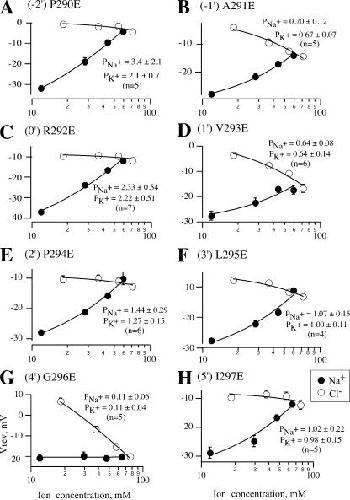 Figure 4. Glutamate scanning reveals a pattern that alternates between cation and nonspecific permeability. (A–H) For each indicated glutamate mutant, reversal potentials were measured in solutions with different concentrations of sodium (solid) or chloride (open). Lines are GHK fits to the data. Reversal potentials were nearly unaffected by chloride concentration in mutants that are cation preferring (A, C, and E), while for nonselective mutants the reversal potentials were shifted by changes in sodium or chloride concentration (B, D, G, and H). Systematic substitution of glutamate for each amino acid from −2′ to 5′ exhibited a nearly alternating pattern of cation-preferring receptors and nonselective receptors. |