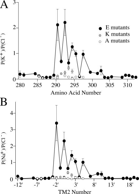 Figure 5. Alternate glutamate mutants at the intracellular end of TM2 are cation preferring. (A) Relative potassium permeability plotted against amino acid number shows the alternating pattern of cationic glutamate mutants (solid circles). Substitutions by positive lysine residues (gray circles) resulted in only small increases in potassium permeability. Substitution by neutral alanines (open circles) had no significant effect on ionic permeabilities. (B) Same as A, showing relative sodium permeability of mutant receptors. |