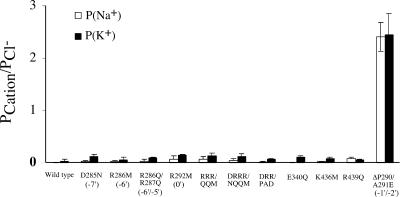 Figure 6. Endogenous charged residues in the wild-type receptor have little effect on ionic permeability. Charged amino acids at the intracellular membrane interface were neutralized to examine the role of native charges on ionic permeability. Although small elevations in relative cation permeability were evident, none of the constructs increased relative cation permeability to more than 0.15, in stark contrast to the previously described deletion of P290 and mutation of A291 to E (ΔP290/A291E), shown for comparison (Wotring et al., 2003). RRR/QQM is R286Q/R287Q/R292M, DRRR/NQQM is D285N/R286Q/R287Q/R292M, and DRR/PAD is D285P/R286A/R287D. For the latter case, the mutations were to the corresponding sequence in nAChR rather than a simple neutralization. |