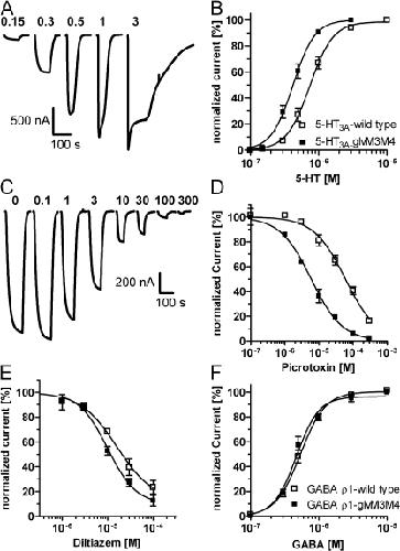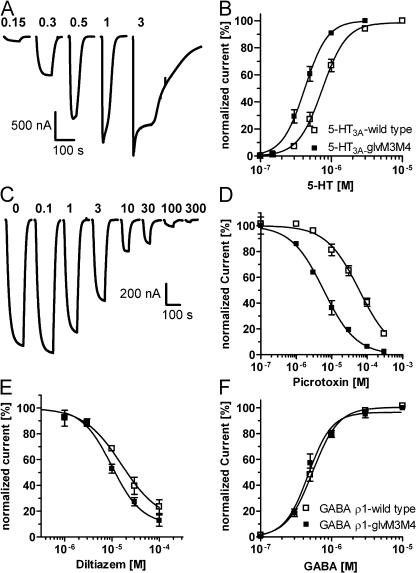 Figure 2. The pharmacological characteristics of 5-HT3A-glvM3M4 are comparable to 5-HT3A. (A) Application of increasing 5-HT concentrations elicits inward currents with increasing amplitudes in 5-HT3A-glvM3M4–expressing oocyte. 5-HT concentrations (μM) are above corresponding trace. (B) Concentration–response relationship for 5-HT activation of 5-HT3A-glvM3M4 (closed squares) and 5-HT3A (open squares). Currents were normalized to the maximum response for individual oocytes (n = 8). (C) Coapplication of increasing picrotoxin concentrations with the 5-HT EC30 concentration to 5-HT3A-glvM3M4 inhibits 5-HT–activated currents. Picrotoxin concentrations (μM) are above corresponding trace. (D) Picrotoxin concentration–inhibition relationship for 5-HT3A-glvM3M4 (closed squares) and 5-HT3A (open squares) (n ≥ 3). (E) Diltiazem concentration–inhibition relationship. Experiments performed as in C except with diltiazem in place of picrotoxin (n ≥ 3). (F) GABA concentration–response curves for activation of GABA ρ1-glvM3M4 (closed squares) and GABA ρ1 (open squares) (n ≥ 3). In all panels, data points are mean ± SEM.
