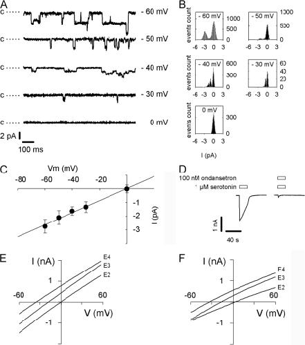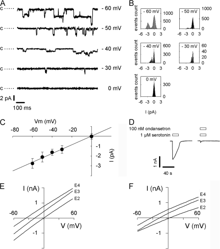 Figure 3. 5-HT3A-glvM3M4 is cation selective with increased single channel conductance. (A) Representative single channel recordings from an outside-out patch containing 5-HT3A-glvM3M4 channels at different holding voltages in the presence of 1 μM 5-HT. The closed state level is indicated by c and dotted line; openings are downward deflections. Records filtered at 1 kHz for display purpose. (B) All-points histograms fitted with two or three Gaussian functions representing closed level and one or two open channels. (C) Mean current and standard deviation obtained from the fit in B plotted as a function of voltage. Chord conductance estimated by linear regression. (D) 100 nM ondansetron inhibits whole cell current induced by 1 μM 5-HT. (E) Change in reversal potential induced by reduction in external NaCl concentration (E2, E3, and E4 contain 145, 72.5, and 36.25 mM NaCl, respectively) for 5-HT3A and (F) for 5-HT3A-glvM3M4.