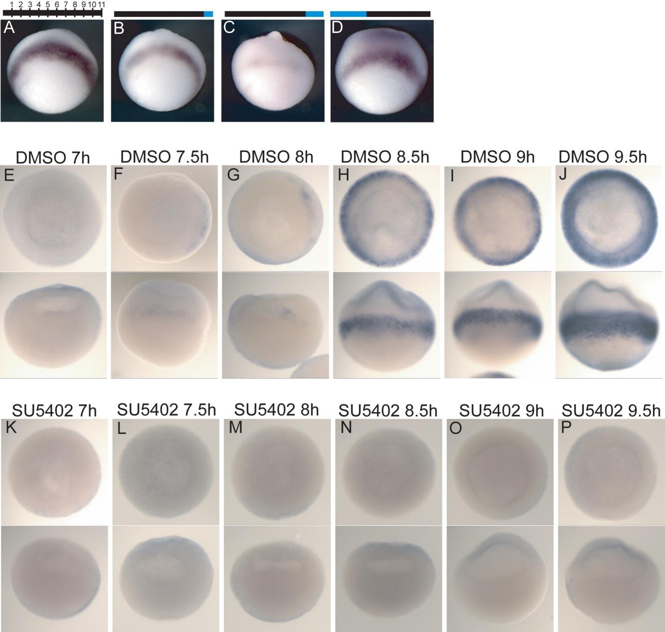 Figure 1. FGF signaling is necessary for initiation of xbra expression. All embryos were processed by RNA in situ hybridization for expression of xbra. Embryos were treated with SU5402 (90-100 mu M) (A-D, K-P) or DMSO alone (E-J). A-D: The bar represents time from fertilization until 11 hr post-fertilization with each hour represented by hash marks; the black region represents the time the embryos were in carrier (DMSO) only, and the blue region represents the time frame when embryos were treated with the inhibitor SU5402. Lateral views. A: DMSO only. B,C: Initially treated with DMSO, then SU5402 was added at 10 and 9 hr post-fertilization, respectively. D: Embryos were first treated with SU5402 then the inhibitor was washed out after 4 hr. E-P: Embryos were treated with either DMSO alone or SU5402 from the 8-16-cell stage until the indicated time point post-fertilization and xbra expression was analyzed in these blastula stage embryos. Embryos were cleared in BB:BA (2:1). The two views in each panel are of the same embryo with an animal pole view above and a lateral view below. |