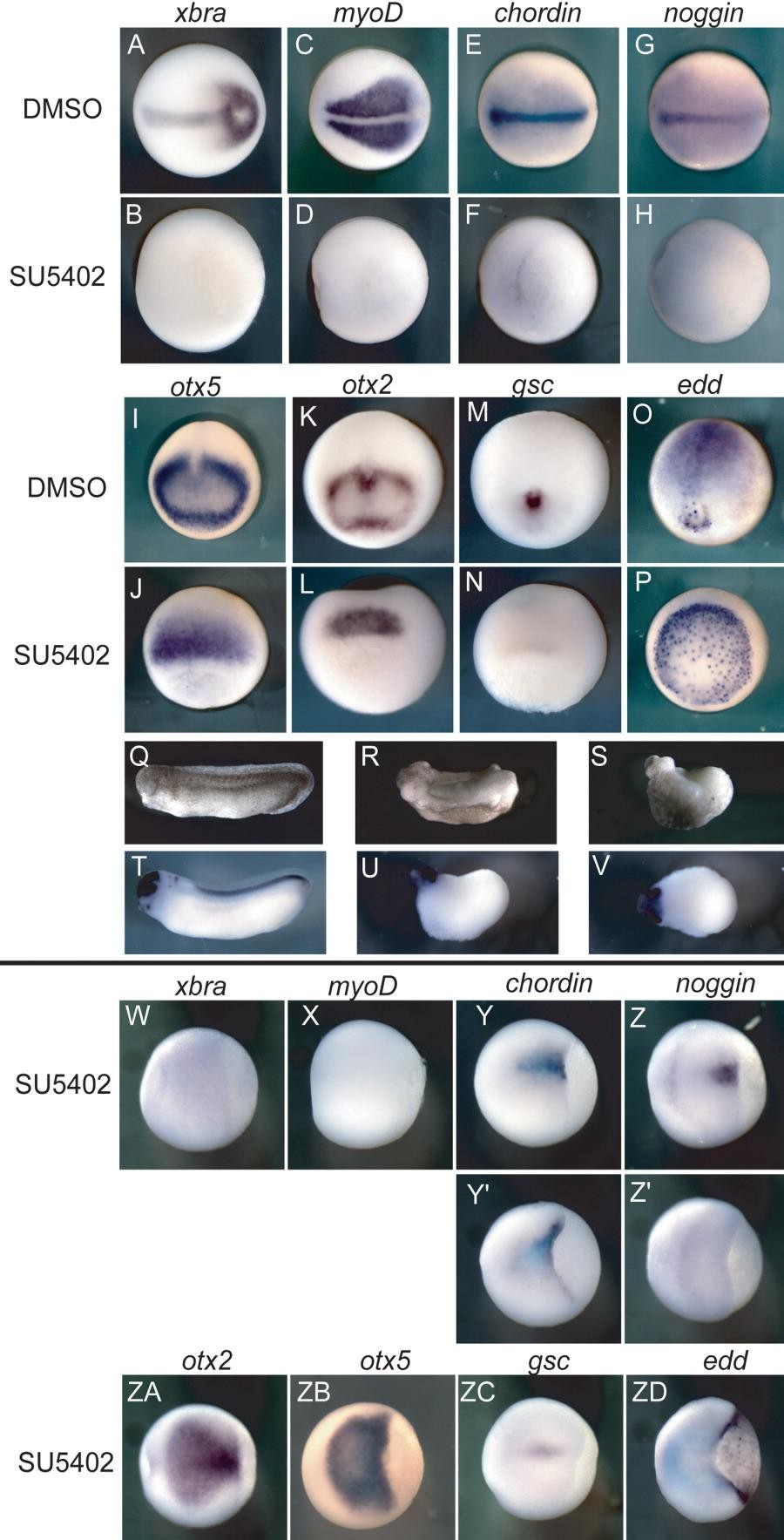 Figure 4. Early FGF signaling is necessary to maintain organizer gene expression. Embryos were treated with either DMSO or SU5402 and analyzed at the early neurula stage for expression of a range of mesodermal, posterior and anterior, and endodermal genes, except for Q-V, which were analyzed at stage 28. A-H,W-ZD: Dorsal views with anterior to the left. I-M: Anterior views. O: Posterior view. J,L,N,P: Dorsal blastoporal views. Q-U: Lateral views, anterior to the left. V: Dorsal view. A-P: Embryos were treated from the 8- to 16-cell stage until the early neurula stage. R: Injected with XFD RNA at 250 pg into each blastomere at the 4-cell stage. S,U,V: Treated from the 8- to 16-cell stage until stage 28. W-ZD: Embryos were treated from mid-gastrulation until the early neurula stage. Y',Z': Embryos demonstrating the range of effects from inhibitor treatment. |