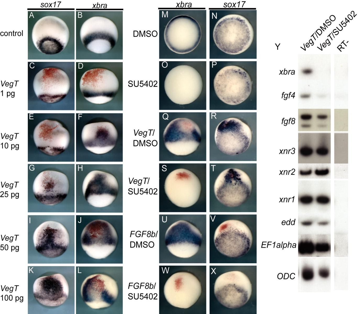Figure 5. VegT activity in the absence of FGF signaling. VegT has dose-specific effects in the whole embryo. A,B: Control uninjected embryos at the mid-gastrula stage and processed by in situ hybridization for expression of sox17 or xbra. C-L: Embryos were injected with different doses of VegT mRNA into one cell at the two-cell stage marked by the lineage tracer nuclear beta -gal in red and analyzed at the mid-gastrula stage. All embryos are displayed in lateral views with the blastopore toward the bottom. At a very low dose, VegT mRNA has no detectable effect (C,D). At the 10-pg dose, VegT induces ectopic xbra expression but not sox17 while higher doses induce ectopic sox17 at the focal point of injection and xbra at the periphery (E-L). M-X: FGF signaling is necessary for VegT-mediated expansion of xbra but not sox17. Embryos were either uninjected, or injected with VegT mRNA (250 pg) or FGF8b mRNA (10 pg) and treated with either DMSO or SU5402 as indicated. At the early gastrula stage, embryos were analyzed for xbra and sox17 expression. Y: An RTPCR experiment on whole embryos treated as indicated along the top and analyzed for a range of markers. EF1 alpha and ODC were used as loading controls. |