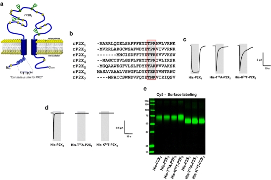 Fig. 1. Effect of site-directed modification of a putative PKC motif on currents mediated by ATP-activated P2X2 and P2X3 receptors. a Schematic model of the transmembrane topology of the rat P2X3 subunit illustrating the N-terminal position of the 12TTK14 sequence. b Alignment of intracellular N-terminal amino acid sequences of the seven P2X subunit isoforms reveals a highly conserved consensus motif, TXR/K. c Typical current traces elicited by applying 10-s pulses of 100 μM ATP to oocytes expressing the indicated wild-type or mutant P2X2 receptors. d Typical current traces elicited by applying 10-s pulses of 100 μM ATP to oocytes expressing the indicated wild-type or mutant P2X3 receptors. Gray areas indicate the duration of ATP application. e All the P2X2 and P2X3 receptors and receptor mutants were expressed efficiently at the cell surface. Intact, healthy oocytes expressing the indicated proteins for 2 days were surface-labelled with the membrane impermeant reactive Cy5 dye and then extracted with dodecylmaltoside. Recombinant proteins were isolated by Ni2+ chelate chromatography and resolved by reducing SDS-PAGE. Shown is a fluorescence scan of an SDS-PAGE gel